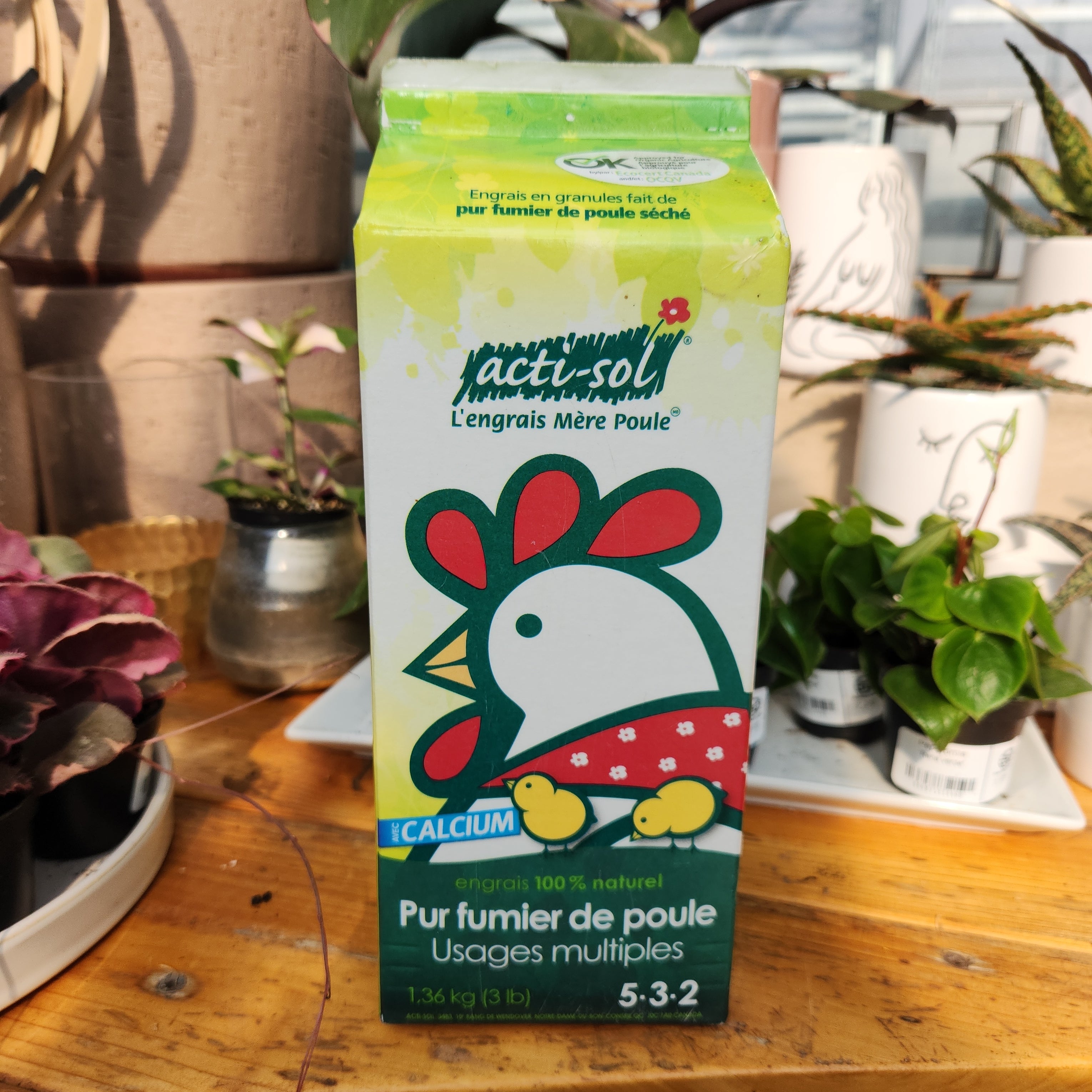 engrais naturel à usages multiples (pur fumier de poule) Acti-Sol 5-3-2Format : 10 kg ou 1,36 kg 100% fumier de poule. Fertilisant naturel passe-partout pour la pelouse, le potager, les fleurs, les arbres fruitiers ou les haies.