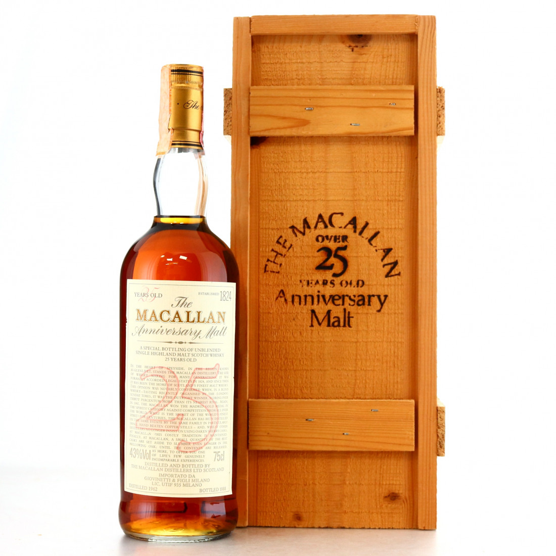 Macallan 25 Year Old Anniversary Malt. Macallan. 25 Year Old Anniversary Malt. Type Scotch. Bottled --. Age 25. Proof 86. Size 700mL.