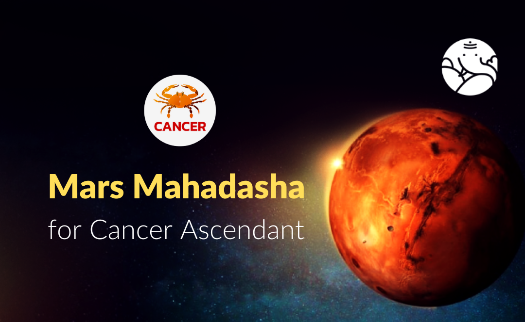 Jupiter Mahadasha for Cancer Ascendant. The Jupiter Vimshottari Mahadasha will bring extreme good result if you belong to Cancer ascendant (Kark Lagna). The planet Guru is the lord of the 6 th house and 9 th house that rules over fate and fortune. This will bring name and fame, honor, social standing, wealth, prosperity and good paternal.