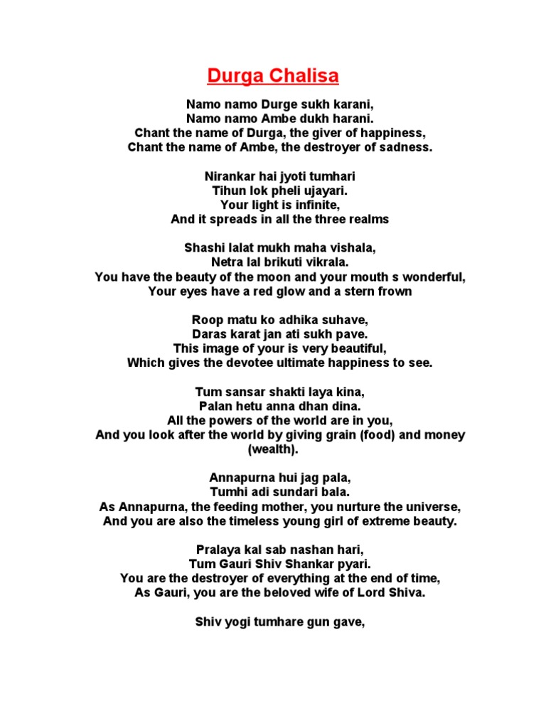 Durga Chalisa is a forty-verse prayer consecrated to Goddess Durga, describing her strength, beauty, and courage. Durga Chalisa lyrics and translation in English: 1.Namo Namo Durge Sukh karani, Namo Namo ambe Dukh harani. I bow to You O Goddess Durga, the granter of happiness! I bow to You O Goddess Amba, who Ends all miseries.