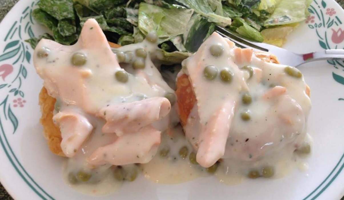 6 vol-au-vent. 2 cuillères à table persil. 3 boîtes de conserve (213 g) saumons. 2 cuillères à thé sauce Worcestershire. 2 1/2 tasses lait. 1/4 cuillère à thé poivre. 1/2 cuillère à thé sel. 1 cuillère à table aneth frais. 1/2 tasse farine tout usage.